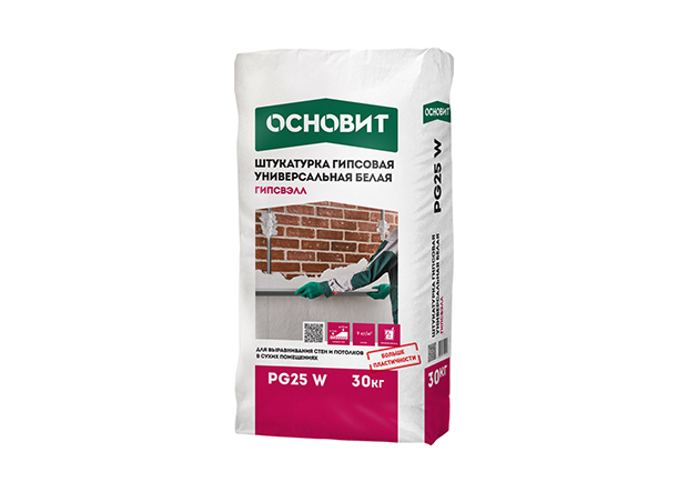 Гипсовая штукатурка белая ОСНОВИТ ГИПСВЭЛЛ PG25 W предназначена для выравнивания стен и потолков в помещениях с нормальной влажностью.