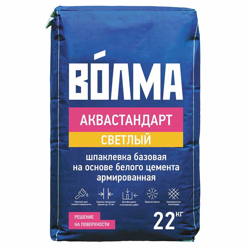 ГОСТ 31357-2007 «ВОЛМА-Аквастандарт светлый» - сухая цементная шпаклевочная смесь на основе белого портландцемента с минеральными и полимерными добавками, безусадочная, влагостойкая, армированная волокнами.